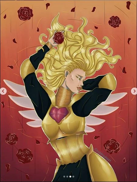 Kalindora had full lips riven by two scars, a small nose, and her eyes were a spiraling gradient of gold. Her armor had a swan motif, with winged shoulders, and had a flaming heart emblem on the breastplate.